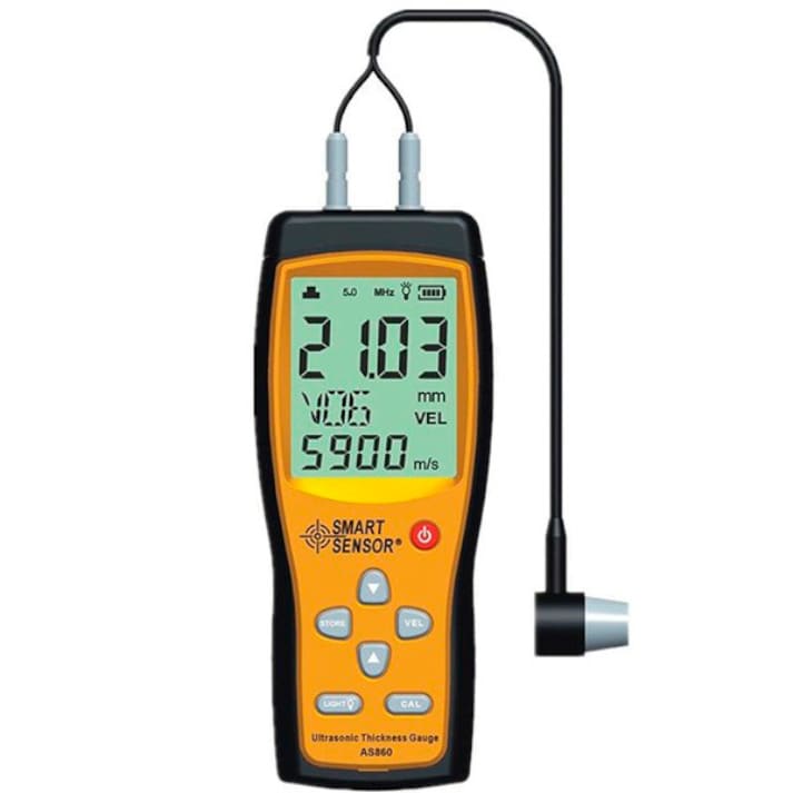 Smart Sensor AS 860 Ultrasonik Kalınlık Ölçer , otomatik kalibrasyon özelliği bulunmaktadır. CAL menüsünde iken; cihazın kutusunun yanında gelen metal kalibrasyon parçasının üzerine prob dokundurularak kalibrasyon yapılır. Smart Sensor AS 860 Ultrasonik Kalınlık Ölçer , ile ölçüm yaparken; probun ölçümü yapılacak malzeme ile bağlantısının doğru yapılıp yapılmadığını anlayabilmek için ekranında kavrama simgesi bulunmaktadır. Smart Sensor AS 860 Ultrasonik Kalınlık Ölçer , ultrasonik ses hızı ayarlanabilir özelliktedir.Smart Sensor AS 860 Ultrasonik Kalınlık Ölçer , Düşük pil göstergesi sayesinde, cihazınızın pili tamamen bitmeden görebilirsiniz. cihazını satın aldığınızda, yanında 1 litre ultrason jeli ücretsiz olarak gönderilecektir.Ölçülen son 12 veriyi hafızasında saklama özelliği bulunmaktadır.Otomatik kapatma ve manuel kapatma özelliği bulunmaktadır. Smart Sensor AS 860 Ultrasonik Kalınlık Ölçer , Karanlık ortamlarda rahatlıkla ölçülen değerleri görebilmeniz için yeşil ekran ışığı bulunmaktadırSmart Sensor AS 860 Ultrasonik Kalınlık Ölçer , Cihazı ve malzemelerini kullanmadığınız zamanlarda rahatlıkla taşıyabilmeniz için darbelere dayanıklı mavi çantası bulunmaktadır.Bu ürün, büyük kristaloid yapısı nedeniyle dökme demir için uygun değildir. Seramik,Demir,Bakir,Altin,Çelik,Plastik,Cam,PVC,Alüminyum,Gümüs gibi pek cok materyalde olçum yapılabilir. TEKNİK ÖZELLİKLERÖlçüm Aralığı1.0 ~ 300mmSes Hızı Aralığı1000 ~ 9999m/sHassasiyet±(1%H+0.1) mmEkran Çözünürlük0.01mmEkranLCDÇalışma Frekansı5MHzAçma/Kapama TuşuVarAğırlık250 grGüç Kaynağı3 x 1.5V AAA